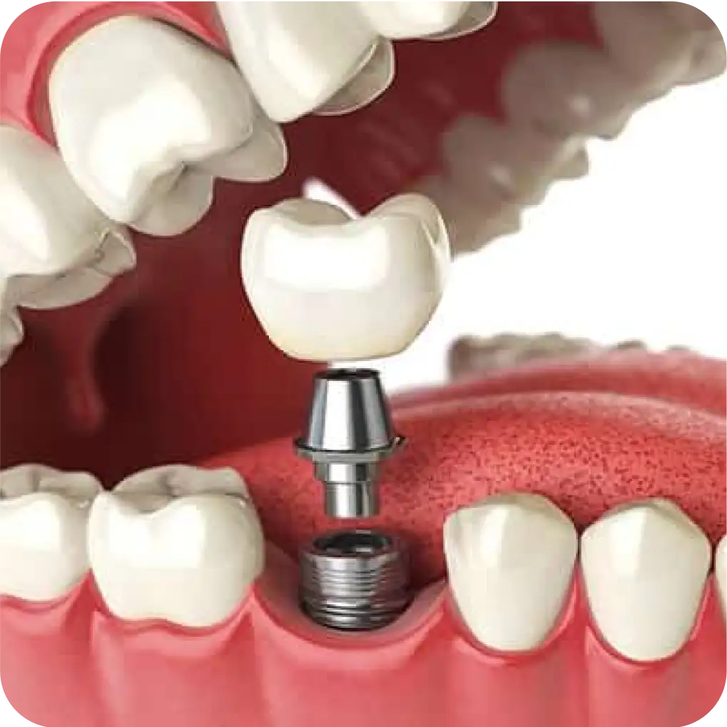 Reposição de dentes perdidos com pinos de titânio e coroas estéticas, oferecendo resultado natural e duradouro.